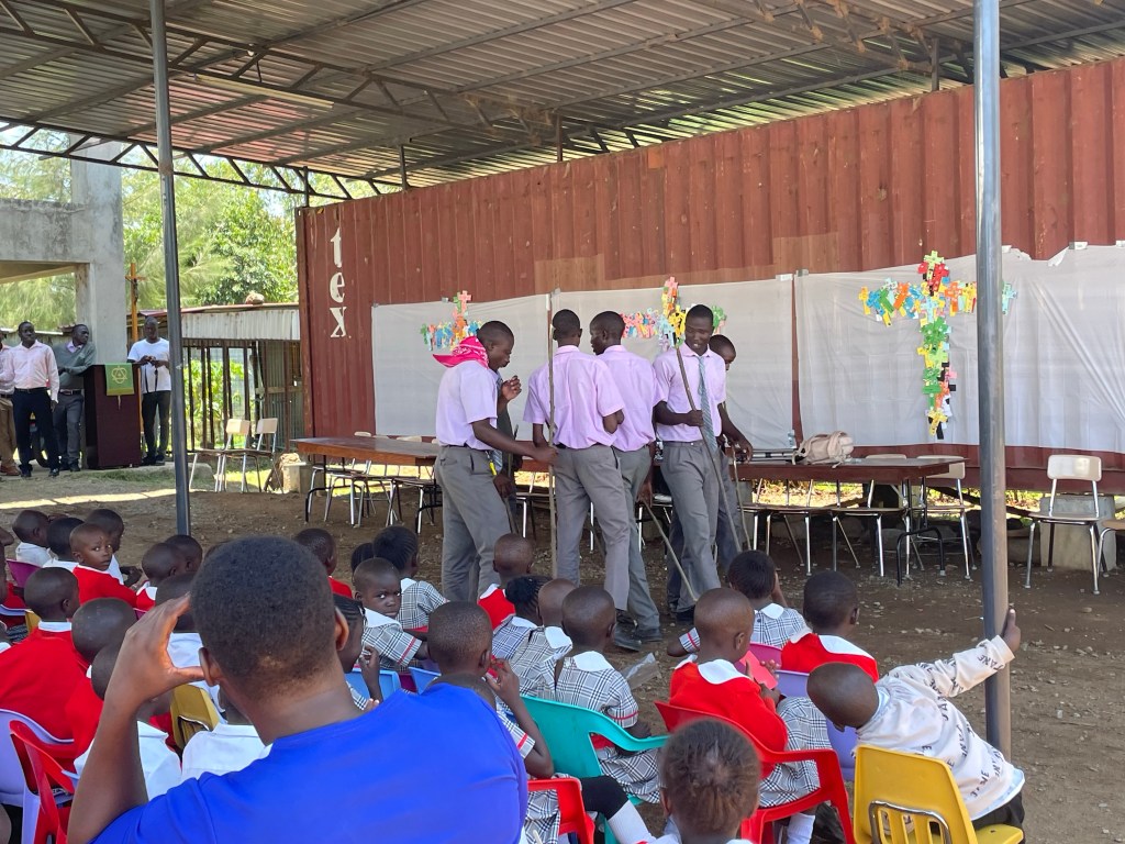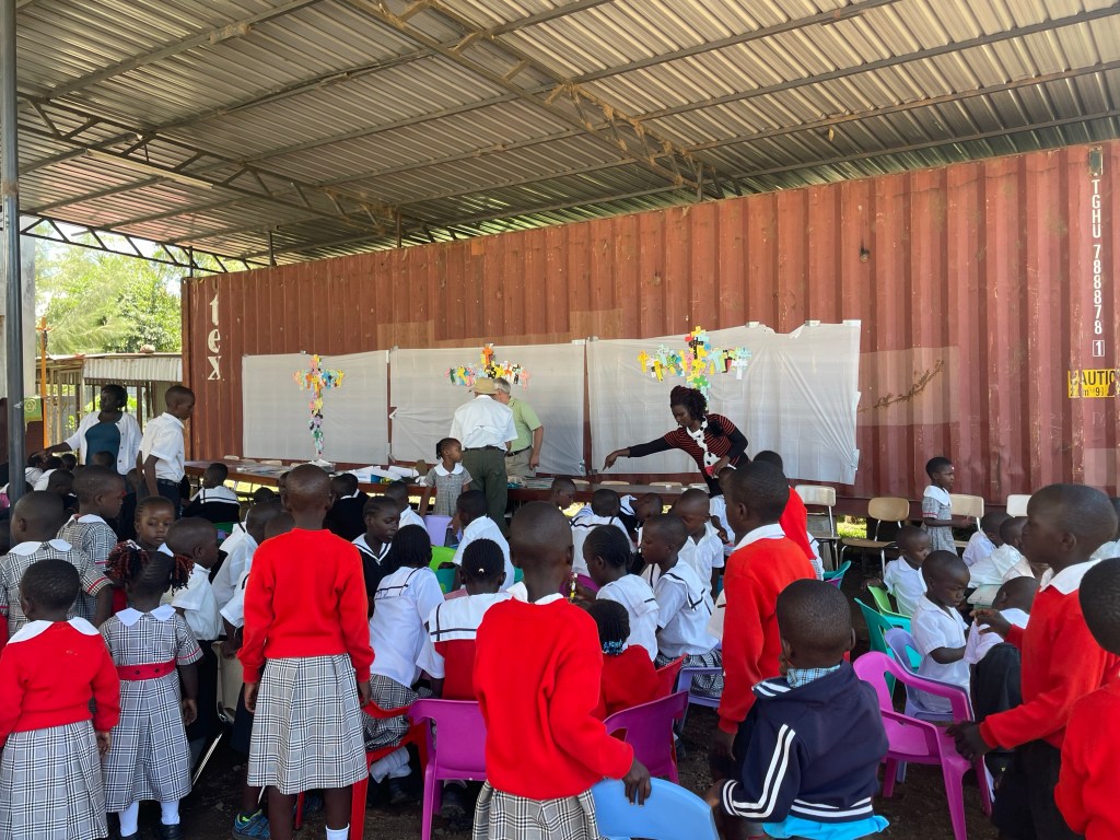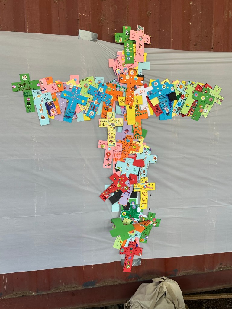 The crafts today, which all the kids enjoyed, were cross necklaces and then a cross made of individual crosses that the kids decorated.